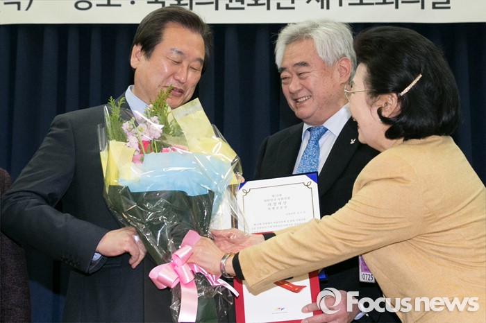 (서울=포커스뉴스) 김무성(왼쪽) 새누리당 대표가 7일 오전 서울 여의도 국회 의원회관에서 열린 대한민국 제19대 국회의원 의정대상 시상식에서 특별공로상을 받고 있다.