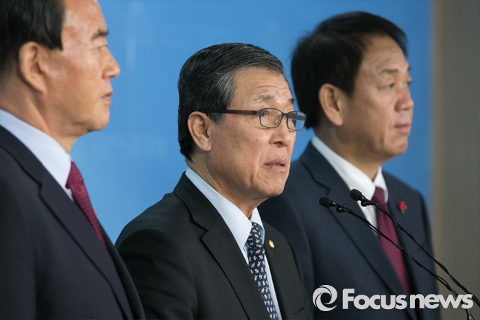 (서울=포커스뉴스) 황진하 새누리당 공천제도특별위원장이 7일 오전 서울 여의도 국회 정론관에서 특위 회의 결과에 대한 브리핑을 하고 있다. 왼쪽부터 홍문표 의원, 황 위원장, 박종희 제2사무부총장.