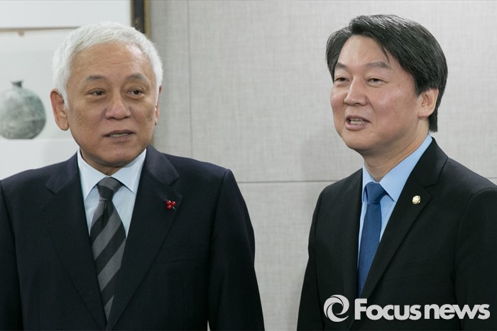 (서울=포커스뉴스) 더불어민주당을 탈당한 김한길(왼쪽), 안철수 의원이 7일 오후 서울 여의도 국회 의원회관 의원식당에서 오찬 회동을 위해 만나, 대화하고 있다.