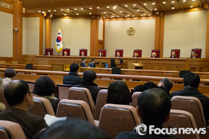 앞서 장 전 회장과 한국일보 대주주들은 지난 2013년 7월 임금과 퇴직금 등을 지급받지 못한 전현직 직원 201명이 법정관리를 신청하자 이를 재산권 침해로 보고 헌법소원을 제기했다.23일 오후 서울 종로구 헌법재판소 대심판정에서 헌법재판관들이 한일청구권협정의 위헌 여부에 대한 선고를 위해 자리에 앉아 있다.2015.12.23 허란 기자