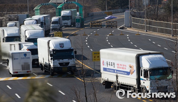 (파주=포커스뉴스) 7일 오후 개성공단 입주기업 차량들이 경기 파주시 남북출입사무소를 통해 입경하고 있다.