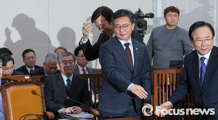 (서울=포커스뉴스) 7일 오후 서울 여의도 국회에서 북한의 수소탄 핵실험 발표 등에 관한 긴급 현안보고를 위해 열린 외교통일위원회 전체회의에 참석해 홍용표(가운데) 통일부 장관과 윤병세(왼쪽) 외교부 장관이 이주영 새누리당 의원과 인사하고 있다.