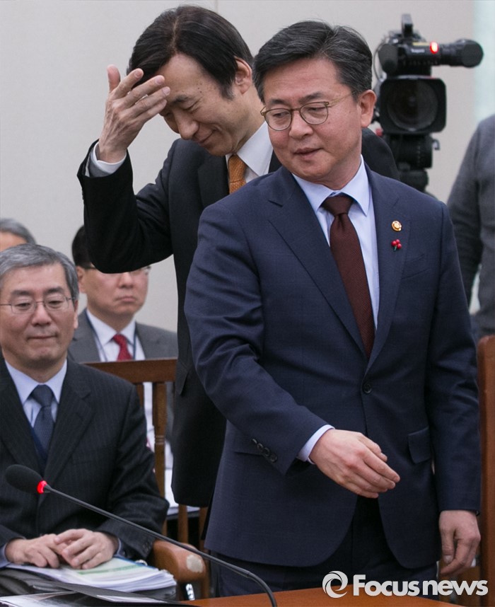 (서울=포커스뉴스) 7일 오후 서울 여의도 국회에서 북한의 수소탄 핵실험 발표 등에 관한 긴급 현안보고를 위해 열린 외교통일위원회 전체회의에 참석한 홍용표(오른쪽) 통일부 장관과 윤병세 외교부 장관이 의원들과 인사한 뒤 자리에 앉고 있다.