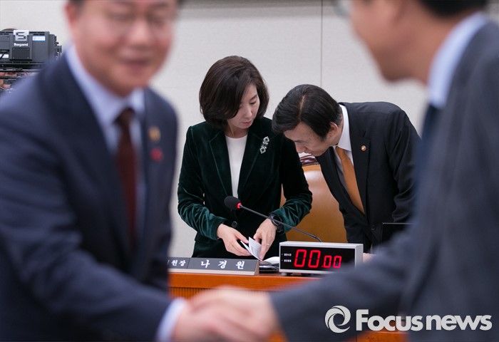 (서울=포커스뉴스) 7일 오후 서울 여의도 국회에서 북한의 수소탄 핵실험 발표 등에 관한 긴급 현안보고를 위해 열린 외교통일위원회 전체회의에 참석한 윤병세(오른쪽) 외교부 장관과 나경원 외통위원장이 대화하고 있다.