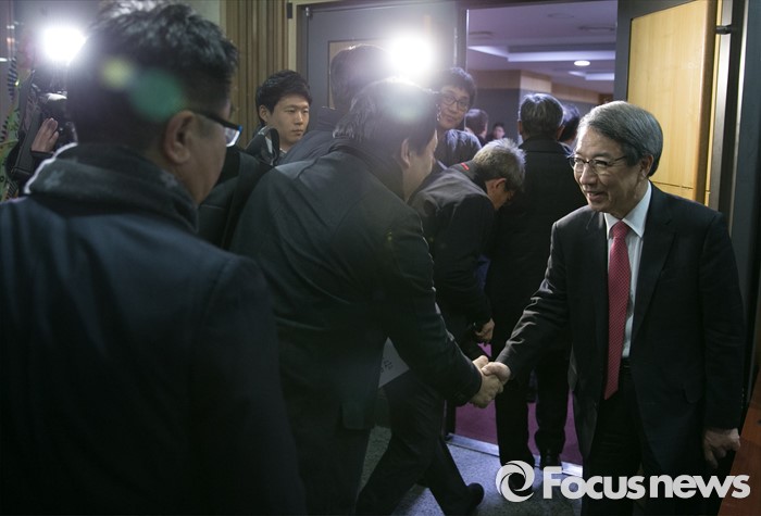 (서울=포커스뉴스) 7일 오후 서울 여의도 국회 의원회관에서 동반성장연구소 주최로 열린 '동반성장과 경제민주화, 잘 되고 있는가?' 포럼에 참석한 정운찬 전 총리가 참석자들을 맞이하고 있다.