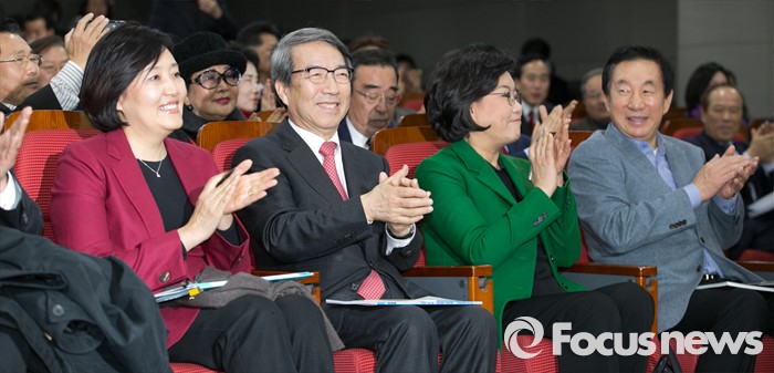 (서울=포커스뉴스) 7일 오후 서울 여의도 국회 의원회관에서 동반성장연구소 주최로 열린 '동반성장과 경제민주화, 잘 되고 있는가?' 포럼에 참석한 김성태(오른쪽부터) 새누리당 의원, 이혜훈 전 의원, 정운찬 전 총리, 박영선 더불어민주당 의원이 박수치고 있다.