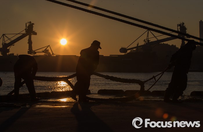 (동해=포커스뉴스) 7일 오전 강원 동해항 중앙부두에 중국 천해크루즈사의 스카이씨 골든 에라호가 승객 1천800여 명을 싣고 입항, 직원들이 밧줄로 배를 고정하고 있다.