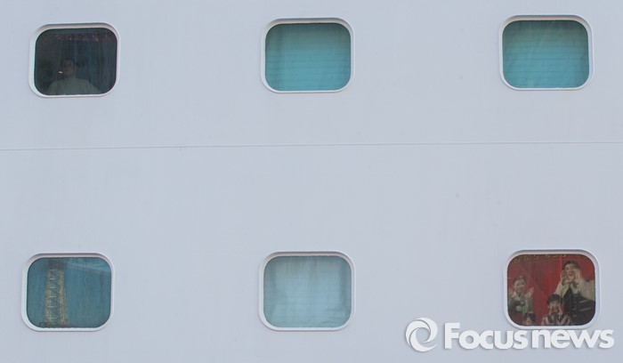 (동해=포커스뉴스) 7일 오전 강원 동해항 중앙부두에 중국 천해크루즈사의 스카이씨 골든 에라호가 승객 1천800여 명을 싣고 입항, 배의 유리창에 중국 관광객을 환영하는 현수막이 비치고 있다.