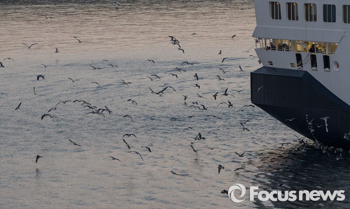 (동해=포커스뉴스) 7일 오전 강원 동해항 중앙부두에 중국 천해크루즈사의 스카이씨 골든 에라호가 승객 1천800여 명을 싣고 입항, 관광객들이 갈매기에게 먹이를 주고 있다.