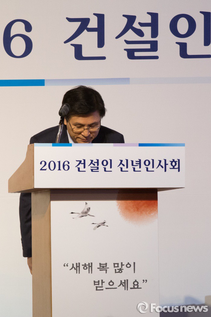 (서울=포커스뉴스) 황교안 국무총리가 7일 오후 서울 중구 롯데호텔에서 열린 2016 건설인 신년인사회에 참석해 신년사를 끝내고 인사하고 있다.