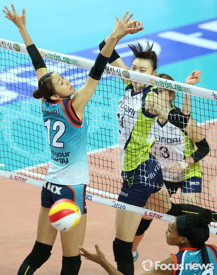 (서울=포커스뉴스) 7일 장충체육관에서 열린 '2015-2016NH농협 V-리그' 여자부 GS칼텍스-현대건설 경기에서 현대건설 양효진이 GS칼텍스 한송이의 블로킹을 피해 공격을 성공시키고 있다.