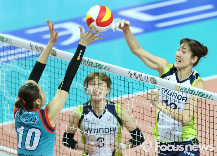 (서울=포커스뉴스) 7일 장충체육관에서 열린 '2015-2016NH농협 V-리그' 여자부 GS칼텍스-현대건설 경기에서 현대건설 김세영이 GS칼텍스 배유나의 블로킹위로 연타 공격을 하고 있다.