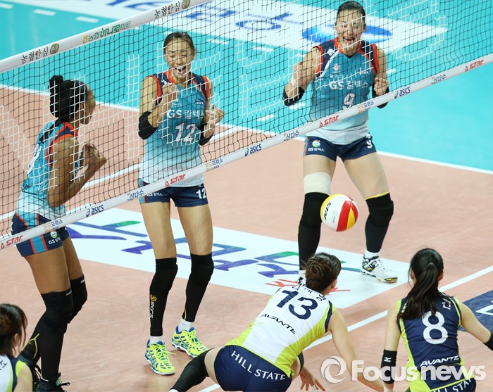 (서울=포커스뉴스) 7일 장충체육관에서 열린 '2015-2016NH농협 V-리그' 여자부 GS칼텍스-현대건설 경기에서 GS칼텍스 캣벨, 한송이, 표승주가 블로킹 성공으로 득점을 올리고 환호하고 있다.