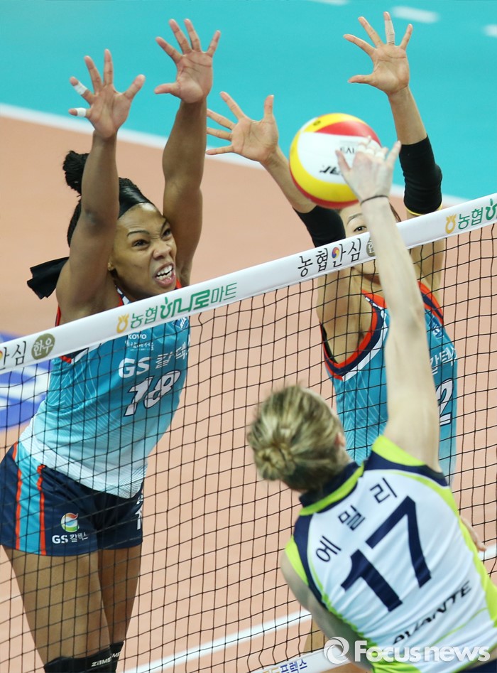 (서울=포커스뉴스) 7일 장충체육관에서 열린 '2015-2016NH농협 V-리그' 여자부 GS칼텍스-현대건설 경기에서 GS칼텍스 캣벨과 한송이가 현대건설 에밀리의 공격을 블로킹으로 막고 있다.