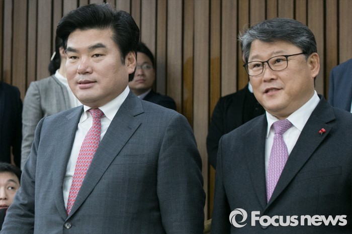 (서울=포커스뉴스) 원유철(왼쪽) 새누리당 원내대표와 조원진 원내수석부대표가 8일 오전 서울 여의도 국회에서 열린 원내대책회의에 참석하고 있다.