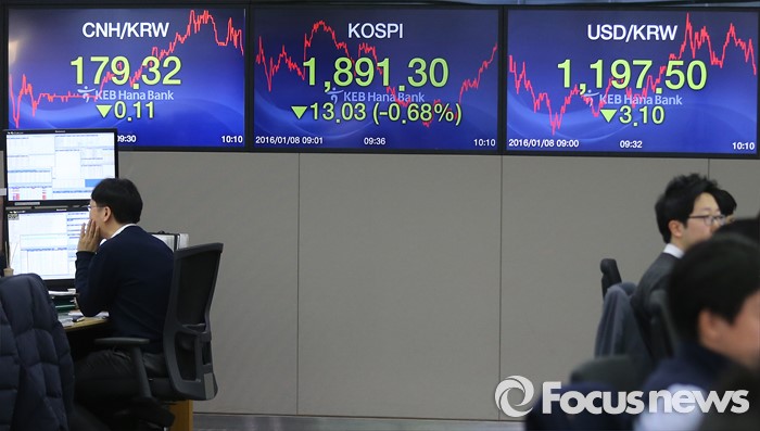 (서울=포커스뉴스) 남북 긴장고조와 중국발 악재 영향으로 코스피 지수 1900선이 무너진 8일 오전 서울 중구 KEB하나은행 딜링룸에서 직원들이 업무에 열중하고 있다.