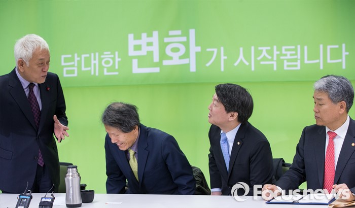 (서울=포커스뉴스) 8일 오전 서울 마포구 안철수 무소속 의원 당사 대회의실에서 열린 창당준비점검회의에 참석한 김한길(왼쪽부터) 의원, 한상진 창당준비위원장, 안 의원, 김동철 의원이 대화하고 있다.