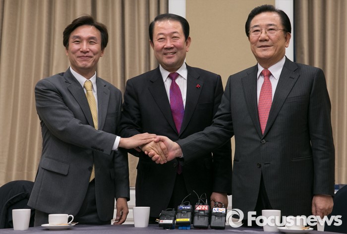 (서울=포커스뉴스) 더불어민주당을 탈당해 신당을 추진 중인 김민석(왼쪽부터) 전 의원, 박주선 의원, 박준영 전 전남지사가 8일 오전 서울 여의도 국회 귀빈식당에서 신당 통합 논의를 위해 만나 취재진을 향해 포즈를 취하고 있다.