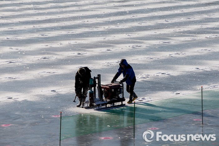 (화천=포커스뉴스) 강원중북부 지역에 한파주의보가 발효된 8일 오전 강원도 화천군 산천어축제 행사장인 화천천 얼음벌판에서 축제 관계자들이 낚시 구멍을 뚫고 있다.
