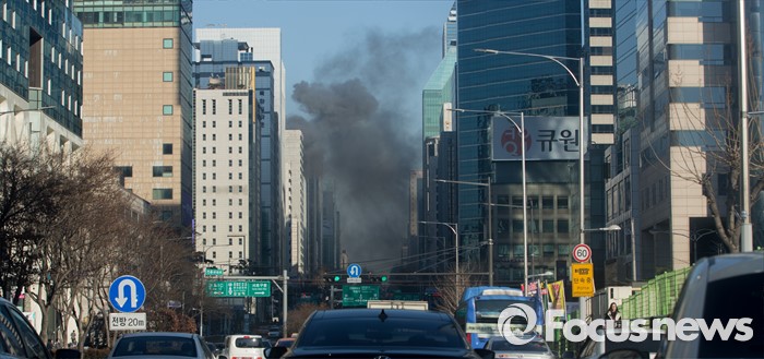 (서울=포커스뉴스) 8일 오후 서울 역삼역 인근 한 건물 공사장에서 화재가 발생, 검은 연기가 치솟고 있다.