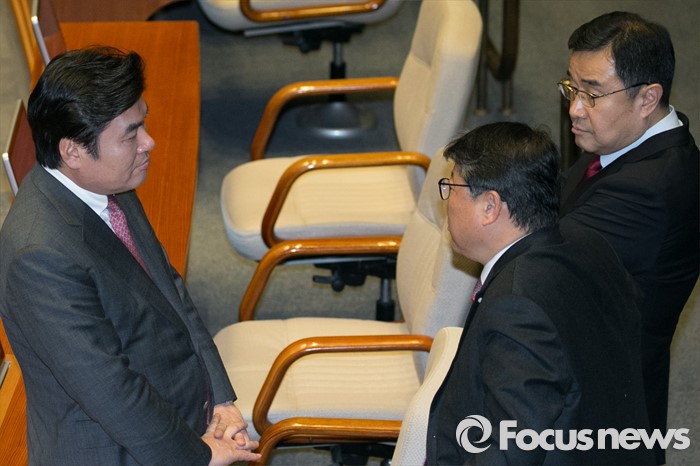 (서울=포커스뉴스) 원유철(왼쪽) 새누리당 원내대표와 김정훈(오른쪽) 정책위의장, 조원진 원내수석부대표가 8일 오후 서울 여의도 국회 본회의장에서 대화하고 있다.