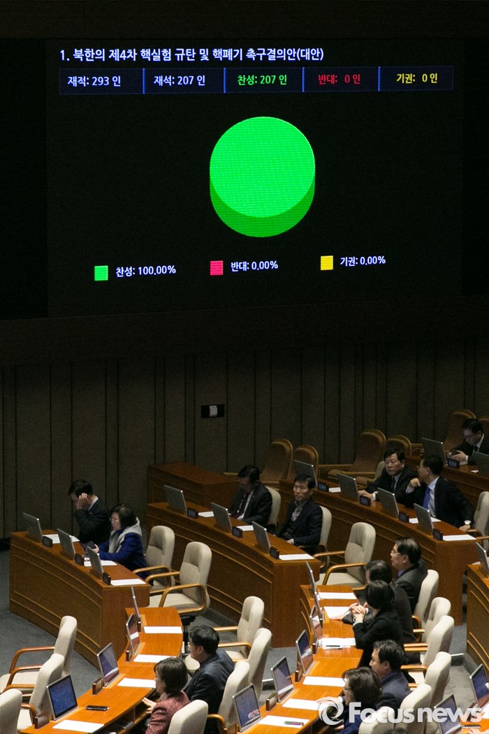 (서울=포커스뉴스) 국회가 8일 본회의를 열고 북한의 4차 핵실험에 대한 규탄 결의안을 통과시켰다.