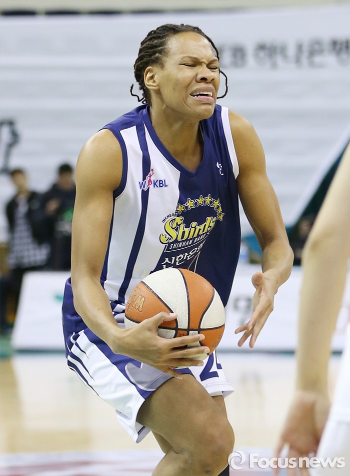 (부천=포커스뉴스) 8일 부천체육관에서 열린 2015-2016 여자프로농구 KEB하나은행-신한은행 경기에서 신한은행 모니크 커리가 KEB하나은행의 파울에 울상을 하고 있다.