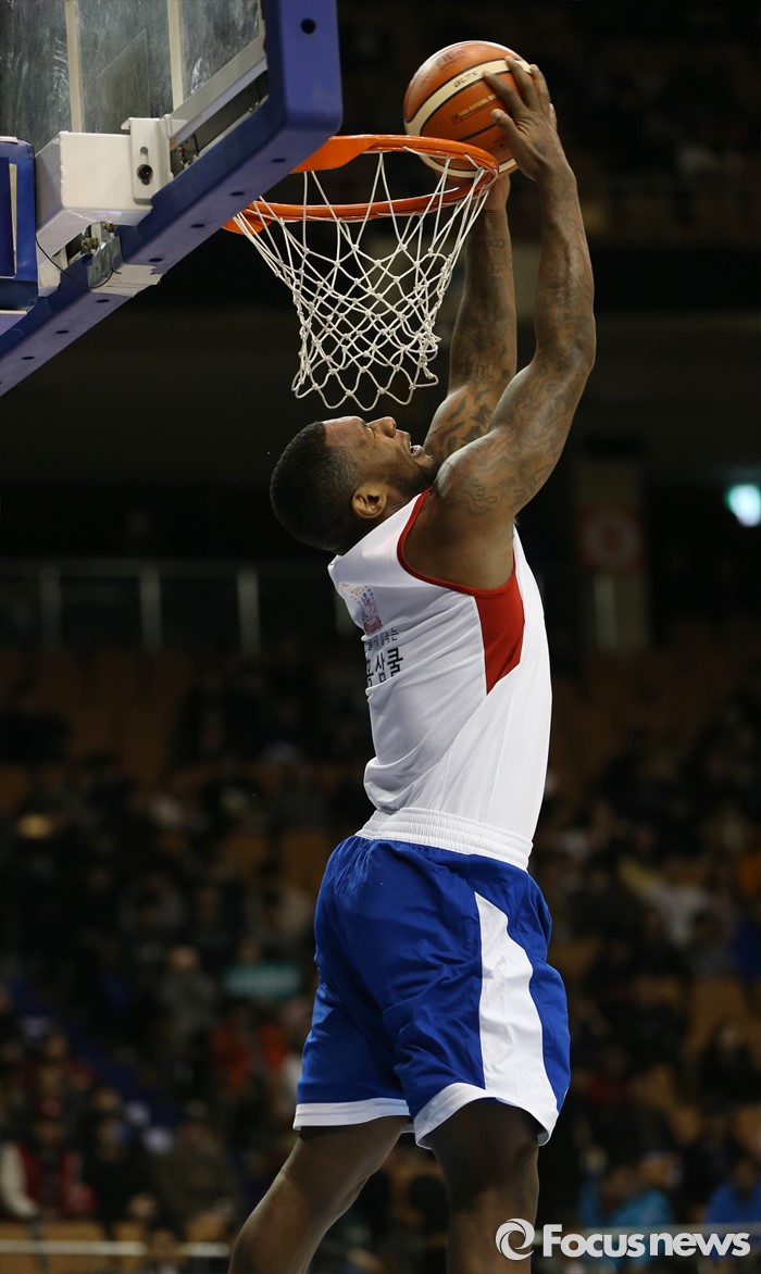 (서울=포커스뉴스) 10일 서울 잠실실내체육관에서 열린 2015-2016 프로농구 올스타전 덩크슛 콘테스트 예선에서 맥키네스가 백덩크슛을 구사하고 있다.