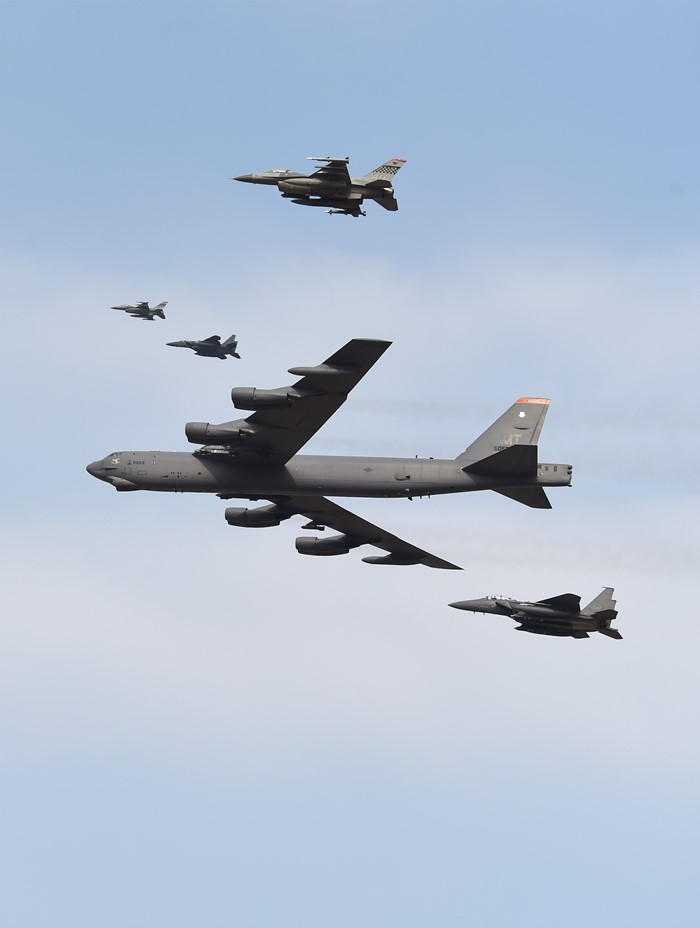 (서울=포커스뉴스) 북한의 수소폭탄 실험 이후 미국의 핵우산 제공 방침에 따라 미 공군의 전략 폭격기가 한반도로 전개한 10일 경기도 평택시 주한미군 오산공군기지 상공에 B-52 폭격기와 우리 공군의 F-15K와 미군 F-16 전투기의 호위를 받으며 비행하고 있다. <사진제공=국방일보>