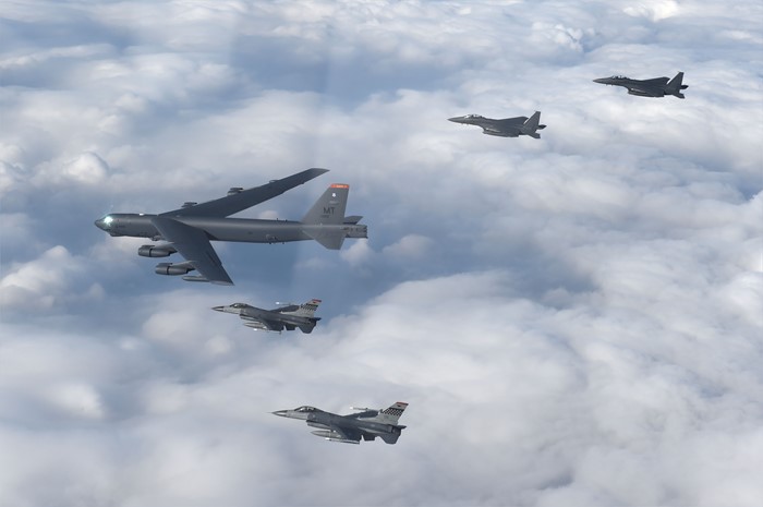(서울=포커스뉴스) 북한의 수소폭탄 실험 이후 미국의 핵우산 제공 방침에 따라 미 공군의 전략 폭격기가 한반도로 전개한 10일 B-52 폭격기와 우리 공군의 F-15K, 미군 F-16 전투기가 한반도 상공을 날고 있다. <사진제공=공군>