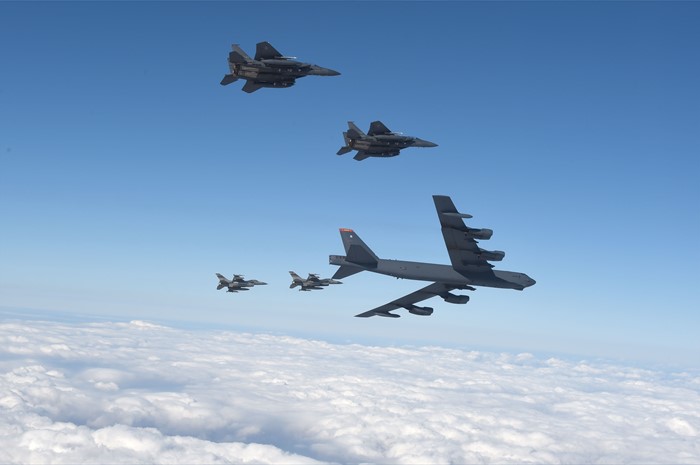 (서울=포커스뉴스) 북한의 수소폭탄 실험 이후 미국의 핵우산 제공 방침에 따라 미 공군의 전략 폭격기가 한반도로 전개한 10일 B-52 폭격기와 우리 공군의 F-15K, 미군 F-16 전투기가 한반도 상공을 날고 있다. <사진제공=공군>
