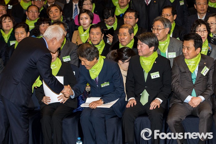 (서울=포커스뉴스) 김한길(왼쪽) 국민의당 의원이 10일 오후 서울 종로구 세종문화회관 세종홀에서 열린 '국민의당 창당발기인대회'에 자리해 한상진 국민의당 창당준비위원회 공동위원장과 악수 하고 있다.