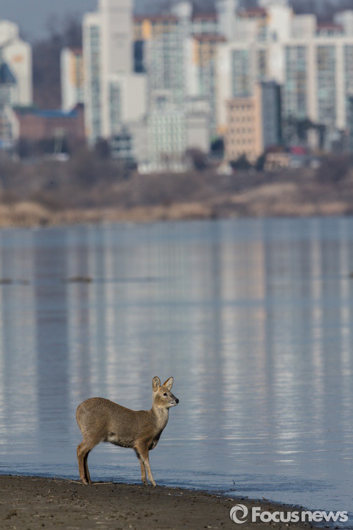 (하남=포커스뉴스) 경기북부에 한파주의보가 내려진 11일 오전 경기도 하남시 한강변이 꽁꽁 얼어붙자, 물 마시러 나온 고라니가 강을 건너가고 싶은 충동을 느낀 듯도심을 바라보고 있다. 한편 기상청은 서울지방은 체감온도가 섭씨 영하 9.2도로 온종일 강한 바람과 추위가 지속된다고 예보하고 있다.