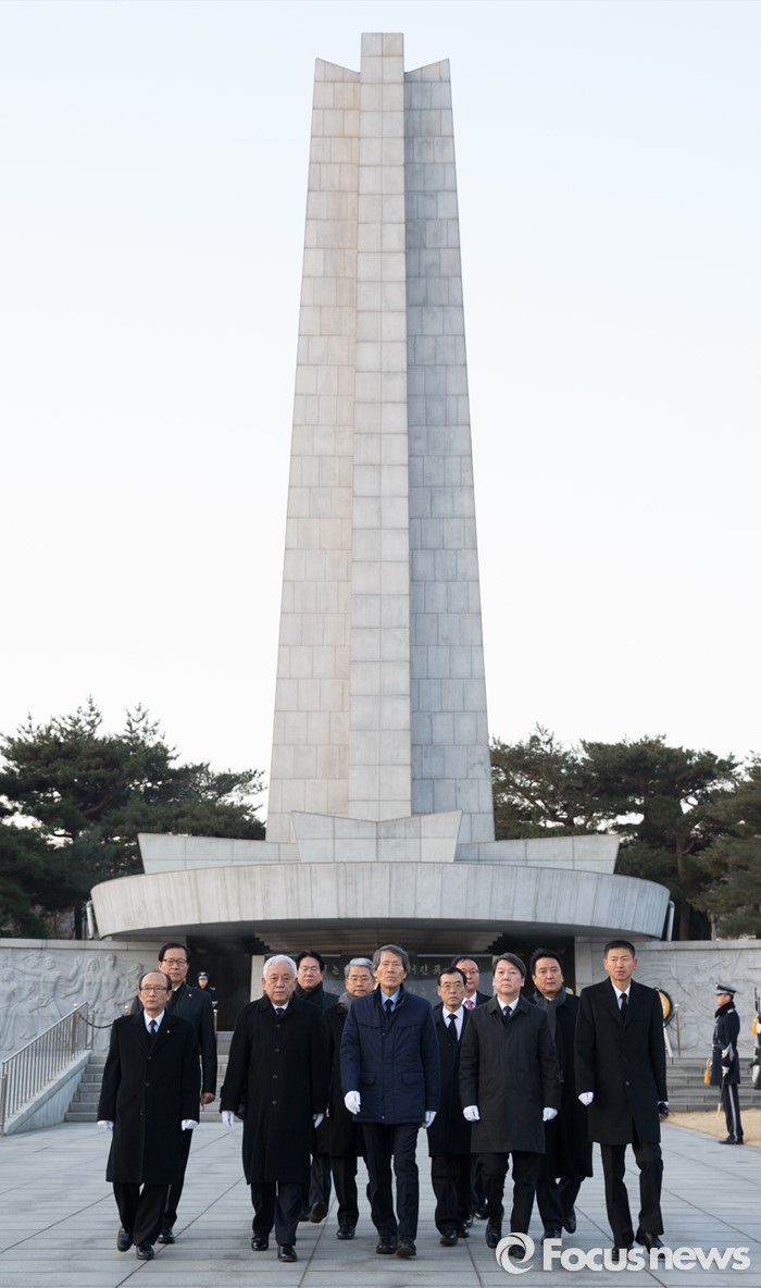 (서울=포커스뉴스) '국민의당' 창당을 추진하는 안철수(오른쪽 두번째부터) 의원, 한상진 국민의당 공동창당준비위원장, 김한길 의원이 11일 오전 서울 동작구 국립서울현충원을 방문해 참배를 마치고 나서고 있다.
