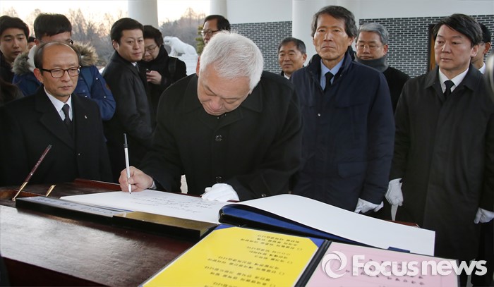 (서울=포커스뉴스) '국민의당' 창당을 준비중인 김한길 의원이 11일 오전 동작구 국립서울현충원 현충탑을 참배한 뒤 방명록을 작성하고 있다.