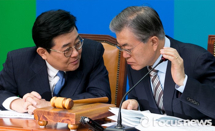 (서울=포커스뉴스) 문재인(오른쪽) 더불어민주당 대표가 11일 오전 서울 여의도 국회에서 열린 최고위원회의에 참석해 전병헌 최고위원과 대화하고 있다.