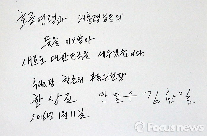 (서울=포커스뉴스) '국민의당' 창당을 준비중인 한상진 공동창당준비위원장과 안철수, 김한길 의원 등이 11일 오전 동작구 국립서울현충원 현충탑을 참배한 뒤 방명록을 작성했다.