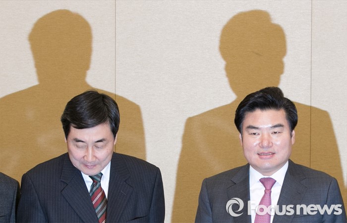 (서울=포커스뉴스) 11일 오전 서울 여의도 국회 귀빈식당에서 20대 총선 선거구 획정 기준 및 쟁점 법안 논의를 위해 진행된 여야 원내지도부 회동에 참석한 원유철(오른쪽) 새누리당 원내대표와 이종걸 더불어민주당 원내대표가 취재진을 향해 포즈를 취하고 있다.