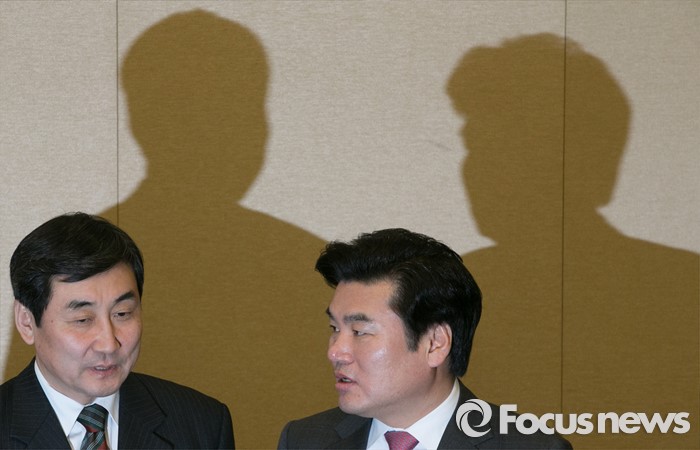 (서울=포커스뉴스) 11일 오전 서울 여의도 국회 귀빈식당에서 20대 총선 선거구 획정 기준 및 쟁점 법안 논의를 위해 진행된 여야 원내지도부 회동에 참석한 원유철(오른쪽) 새누리당 원내대표와 이종걸 더불어민주당 원내대표가 대화하고 있다.
