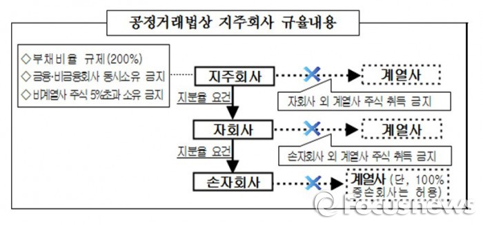 공정거래법에 따르면 일반지주회사의 손자회사는 지분 100%를 보유한 증손회사 외의 국내 계열회사 주식을 소유할 수 없도록 돼 있다.