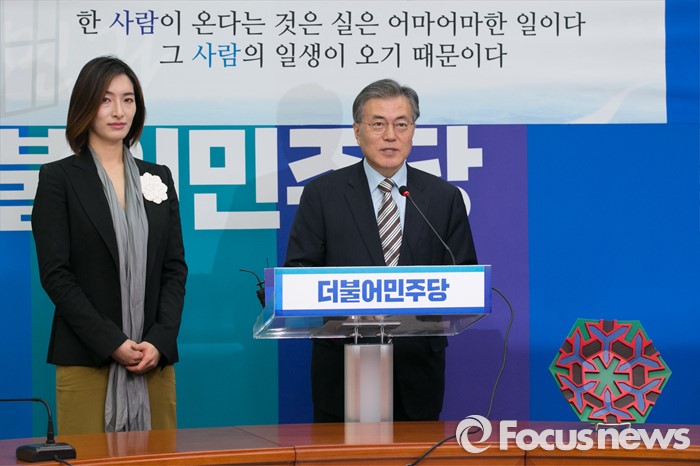 (서울=포커스뉴스) 문재인(오른쪽) 더불어민주당 대표가 11일 오후 서울 여의도 국회 당대표회의실에서 김빈(왼쪽) 디자이너의 입당 기자회견에 참석해 인사말을 하고 있다.