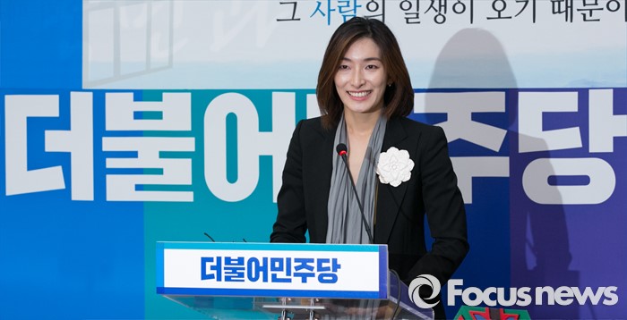 (서울=포커스뉴스) 11일 오후 서울 여의도 국회 더불어민주당 당대표회의실에서 김빈 디자이너가 입당 기자회견을 하고 있다.