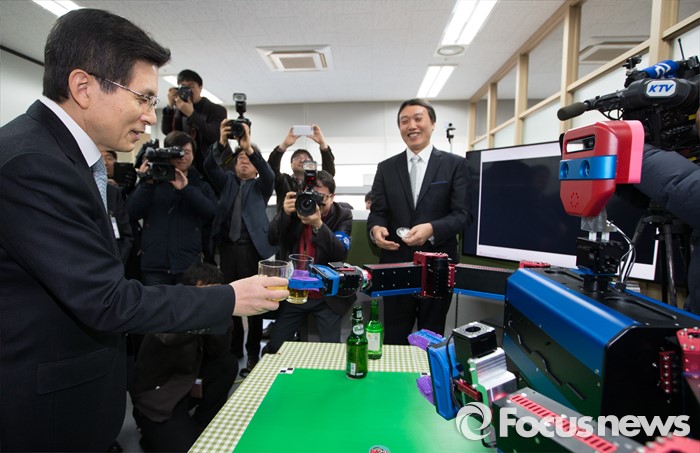 (대전=포커스뉴스) 황교안 국무총리가 11일 대전 유성구 융합기술연구생산센터 내 마젠타로보틱스를 방문, 도장로봇이 소맥 폭탄주제조 시연을 지켜본 뒤 건배를 하고 있다.