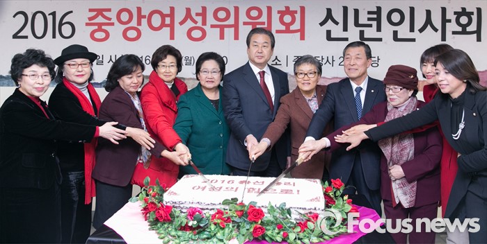 (서울=포커스뉴스) 김무성(왼쪽 여섯번째) 새누리당 대표가 11일 오후 서울 여의도 당사에서 열린 2016 중앙여성위원회 신년인사회에 참석해 김을동(왼쪽 다섯번째) 최고위원, 황진하(오른쪽 네번째) 사무총장, 이에리사(오른쪽 다섯번째) 중앙여성위원장 등 참석자들과 떡 케이크를 자르고 있다.