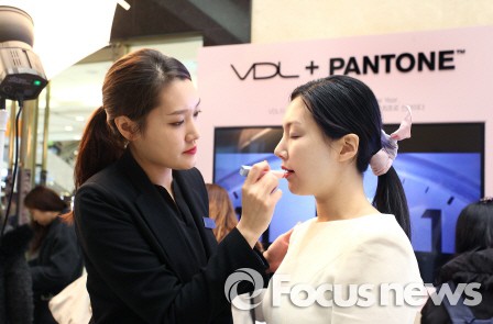 한편 컬러 컨설팅 기업 팬톤은 올해의 컬러로 옅은 분홍빛의 '로즈쿼츠'와 하늘처럼 산뜻하고 가벼운 느낌의 '세레니티'를 등 16여종의 컬러를 꼽았다.롯데백화점 본점에서 운영 중인 팝업스토어 'VDL 팬톤 스테이션'에서 한 소비자가 메이크업을 받고 있다. <사진제공=LG생활건강>