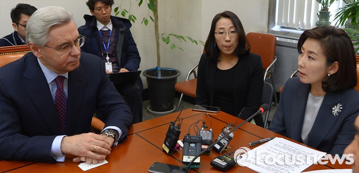 (서울=포커스뉴스) 11일 오후 서울 여의도 국회 외교통일위원회에서 나경원(오른쪽) 위원장과 여야 의원, 알렉산드르 안드레예비치 티모닌 주한러시아대사가 북한 핵실험 관련 간담회를 하고 있다.