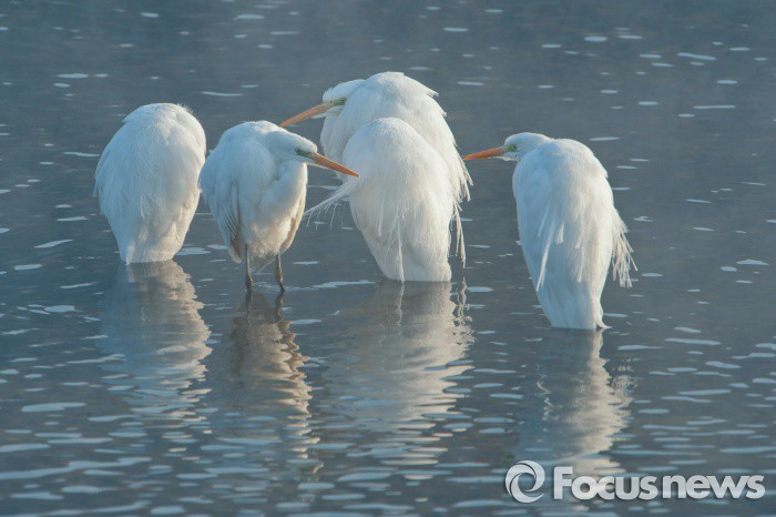 (남양주=포커스뉴스) 올겨울 들어 가장 추운 12일 오전 경기도 낭양주시 조안면 팔당댐 아래 흐르는 물속에서 겨울철새 대백로들이 몸을 최대한 움추리고 깃털을 부풀려 동장군을 견디고 있다. 며칠간 계속된 추위로 한강이 부분적으로 얼었으나, 물살이 흐르는 쪽은 얼지 않아 물새들이 이곳으로 몰리고 있다.