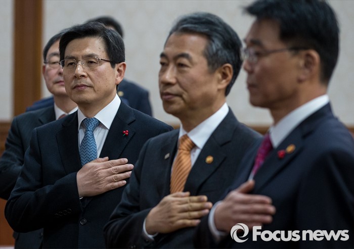 (서울=포커스뉴스) 12일 오전 서울 종로구 정부서울청사에서 열린 국무회의에 황교안 국무총리를 비롯한 국무위원들이 국민의례를 하고 있다.
