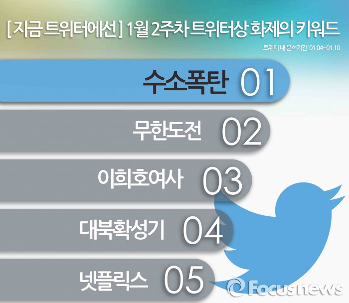 1월 둘째주 급상승 키워드 1위는 ‘수소폭탄’이었다. 지난 6일, 북한 양강도 풍계리 인근에서 발생한 규모 5.1의 지진과 관련해 북한이 수소폭탄 실험에 성공했다고 발표했다.