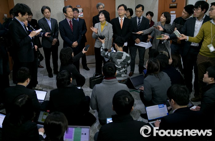 (서울=포커스뉴스) 12일 오전 서울 여의도 국회 정론관에서 조은 더불어민주당 선출직공직자평가위원장과 위원들이 19대 국회의원 평가 종료 기자회견을 마친 뒤 취재진 질문에 답하고 있다.